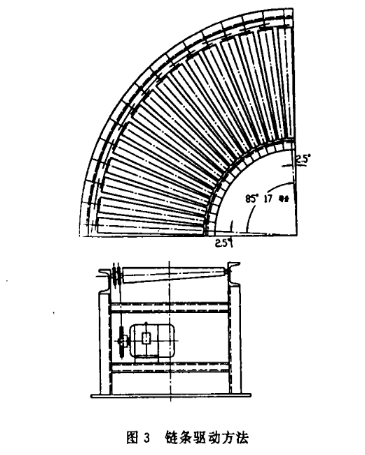在滾筒輸送機的方案中,弧形輥道有兩處。弧形輸送機多為自由式,即無動力驅動,一般都是利用物品的重力,靠輥道傾斜,使物品向前單方向移動適合于輸送較輕物品。而用于車輪往復輸送時,則只能采用動力式。在車輪由直輥道進入弧形輥道時,車輪只有受到足夠的向心力時才能沿著輥道運動;否則車輪將在輥道上偏移。為了獲得向心力,將輥子設計成錐形,并且將上母線調成水平,使整個輸送機構的上平面處在同一標高上,保證車輪平穩移動鏈條驅動方法如圖3所示。在90°彎道中,兩個邊輥的軸線與端面的夾角成2.5°,相鄰兩輥子間軸線夾角如按5°布置,則一共需18根輥子。但在實際使用中,輥子最好多于18根,也就是說夾角應小于5°,否則鏈條很難驅動,鏈條也易從鏈輪上滑落下來。