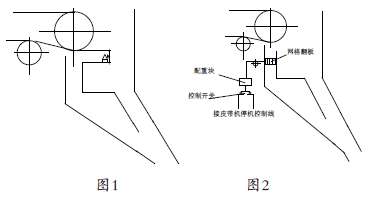 (2)為了使皮帶輸送機在溜槽堵塞后能及時停機,在副溜槽內加一個網格狀翻板(做成網格狀是防止粉塵堆積影響效果),翻板與一個杠桿相連,杠桿的另一端加一組可以調整重量的配重塊,配重塊的重量略重于翻板的重量(根據(jù)具體情況自行掌握),配重塊端與一個控制開關相連(開關的類型和型號根據(jù)具體情況選擇),使開關與輸送機的停機控制線相連接如圖2所示: